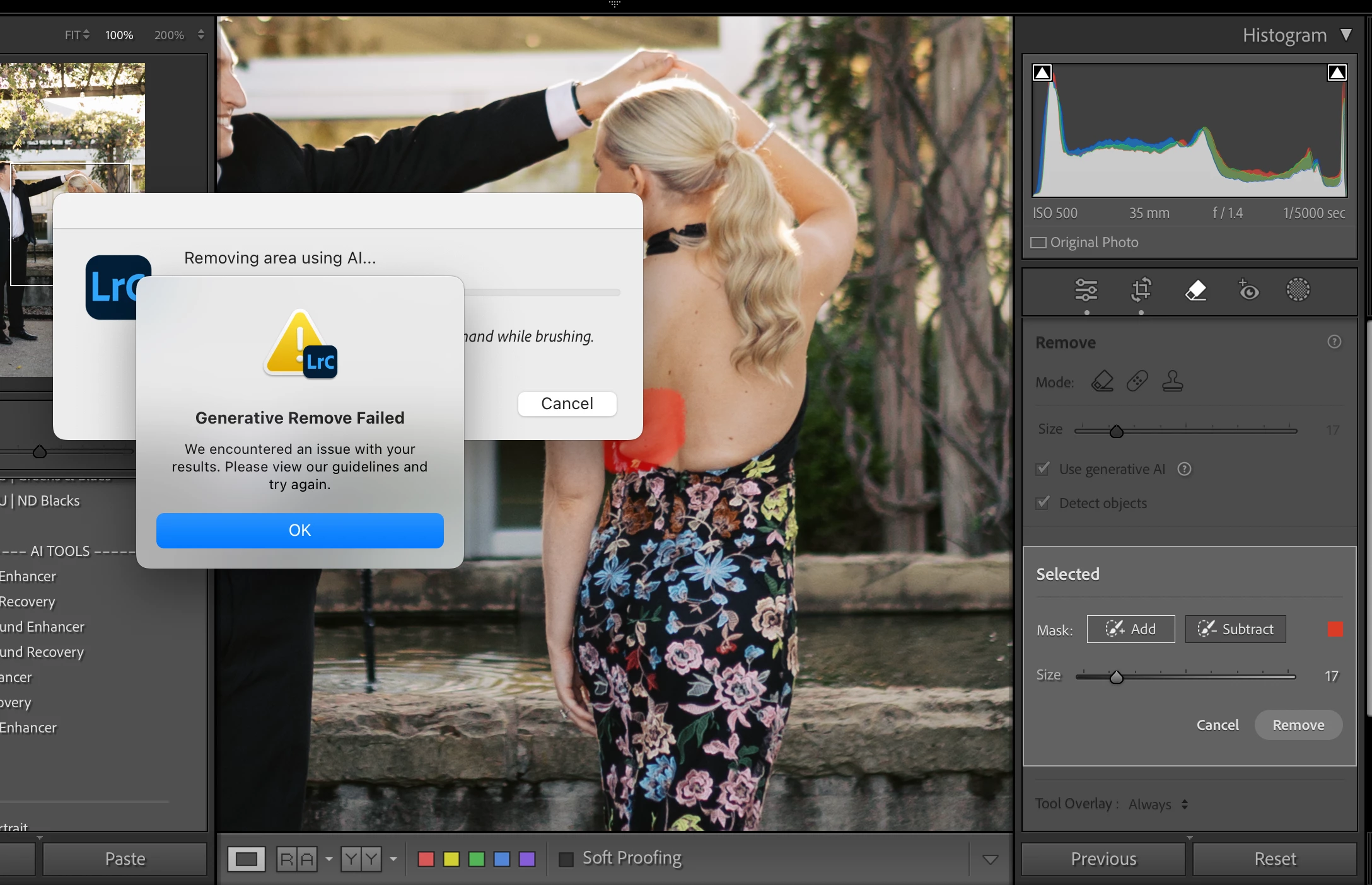 @SamuelStallardPhotography: "There's an issue with smoothing/chaning skin where the generative fill recognizes an "inappropriate" object incorrectly and refuses to generate."