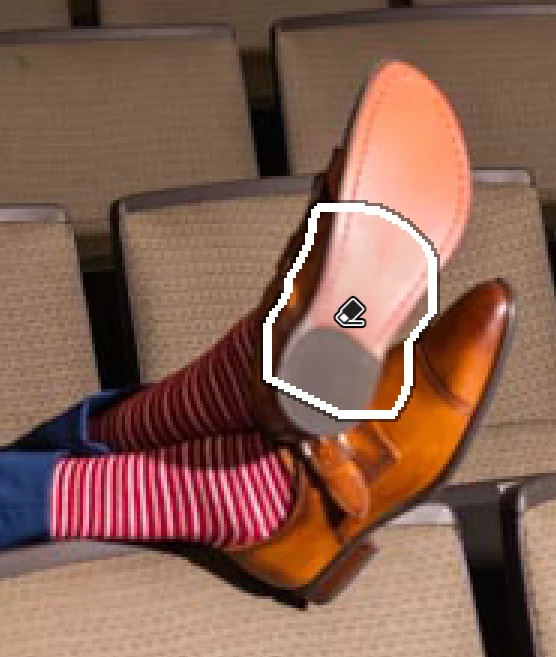 In this case, selecting the white part of the heel and the reflecting scuff marks on the sole causes replacements that try to match the back part of the heel and clean part of the sole, without changing the shape of the shoe: