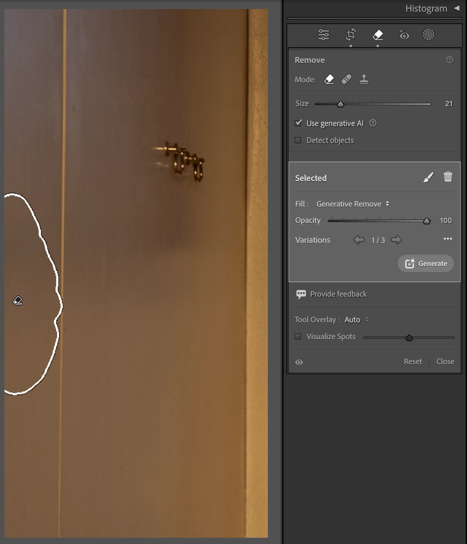 Generative Remove eliminated the doorknob from your screenshot on the first try:
