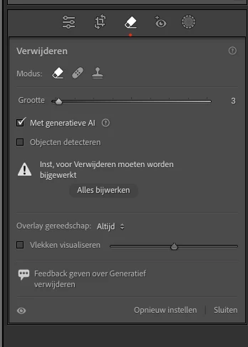 @FleurVastgoedsuppo: "The part that i erased with the erase tool with Generative AI is not erased anymore. Instead it says, the preferences needed to be updated.  ... still needed to update again and again."