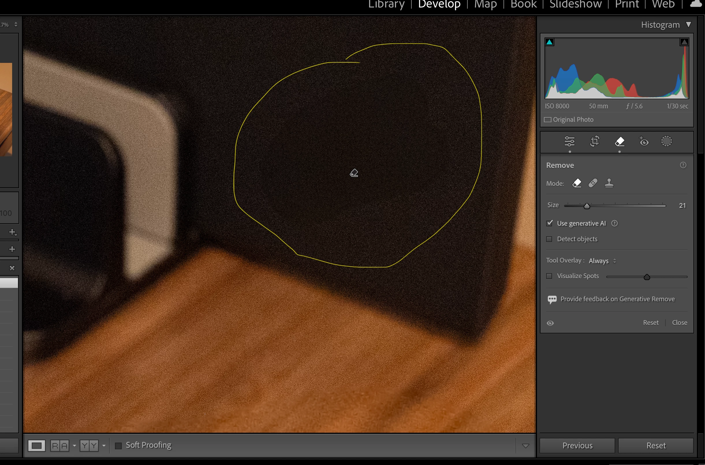 This image was shot at ISO 8,000 so there is some noise in this image, and although LRC removed the logo, it could not properly match the noise levels of the surrounding area to make it 100% invisible.