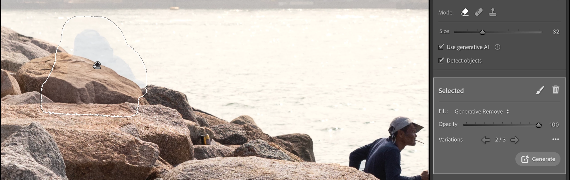 Generative Remove makes it easier to remove unwanted objects and distractions with a simple gesture, even on complex backgrounds. For more accurate results, be sure to include the object's shadow in your selection and/or expand its size.