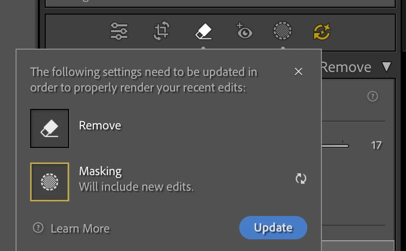 Your screenshot suggests you've applied Remove on top of an AI mask, e.g. Background.  Look in the Develop tool bar -- is the AI Edit Status button yellow? If so, click it and you'll see: