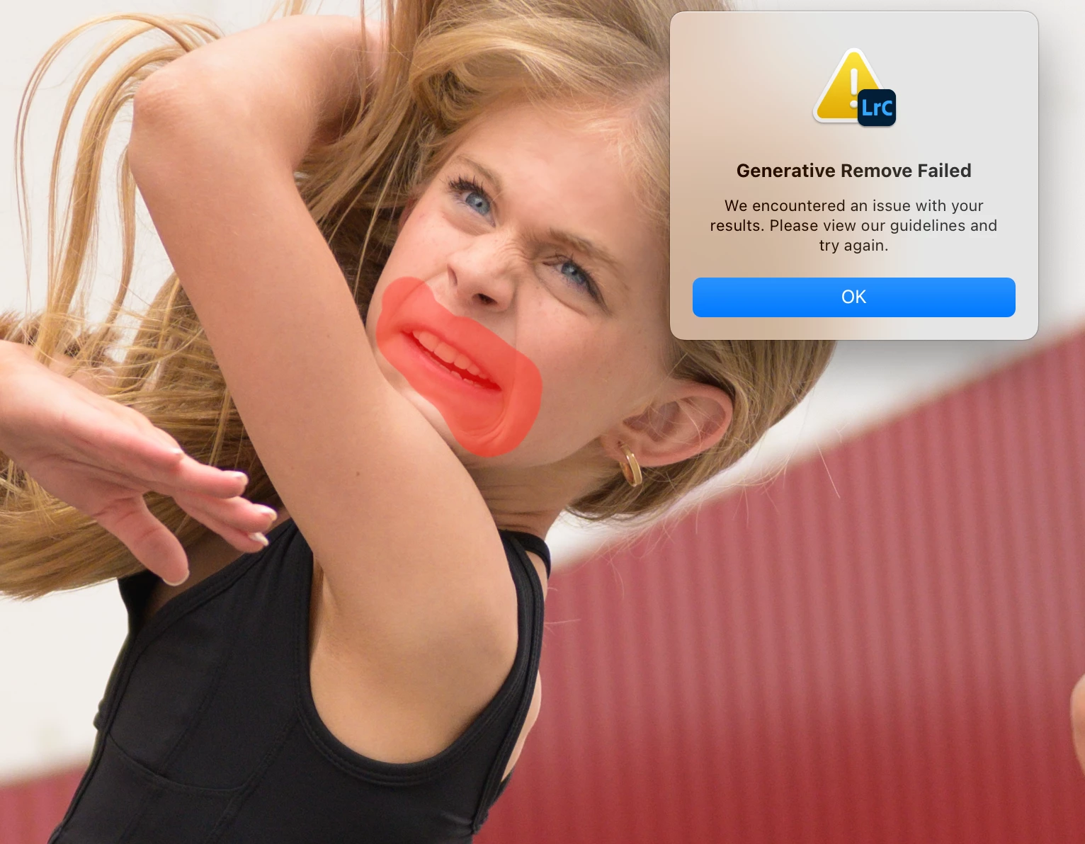 Seriously, you guys have to make your system not have these false flags of 'guidlines'. It actually did allow me to to use the generative Ai remove in this photo on the forehead. But it then wouldn't do anything else on the face.