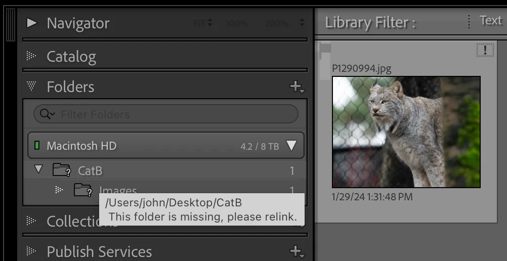 However, If the "Cat A" folder is exposed (show parent of "Images"), and you do the same catalog rename including the parent folder, the renaming of the catalog and its parent folder work fine but both the "Images" folder and its parent folder (still "Cat A" in the folders panel) go missing.