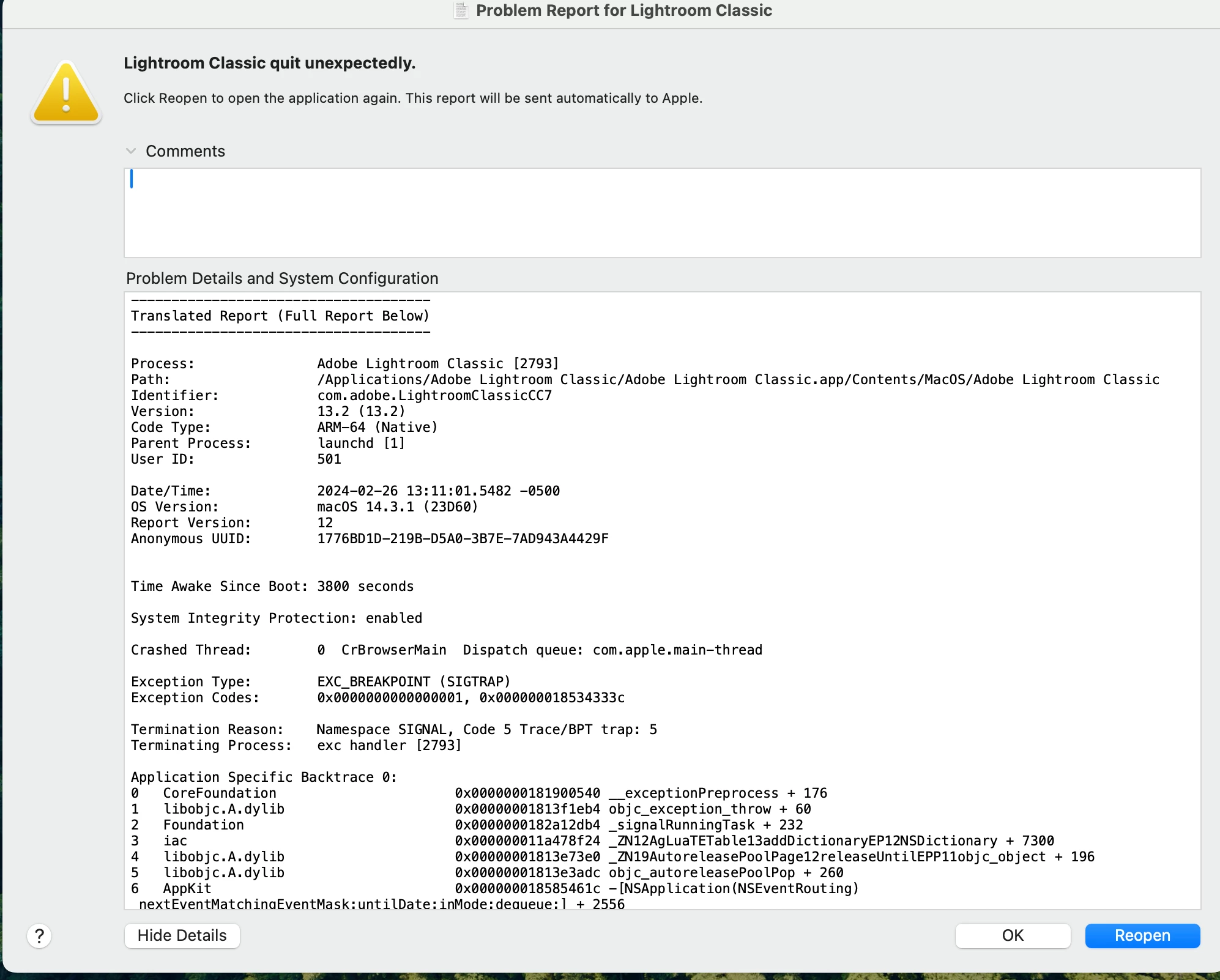 Running Lightroom classic version 13.1 on m1 macbook pro on Mac OS Sonoma 14.3 and every time File > Tethered Capture > Start tethered capture and Press Ok, the application crashes. This happens both with and without a camera connected. My lightroom version is up to date and this crash happens everytime without fail. I've tried clearing the preferences and uninstalling/reinstalling the app as well. Has anyone experienced this? What's the resolution?