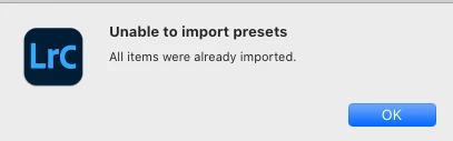 https://community.adobe.com/t5/lightroom-classic/error-warning-quot-unable-to-import-presets-all-items-were-already-imported-quot-but-don-t-see/m-p/11921135#M227294