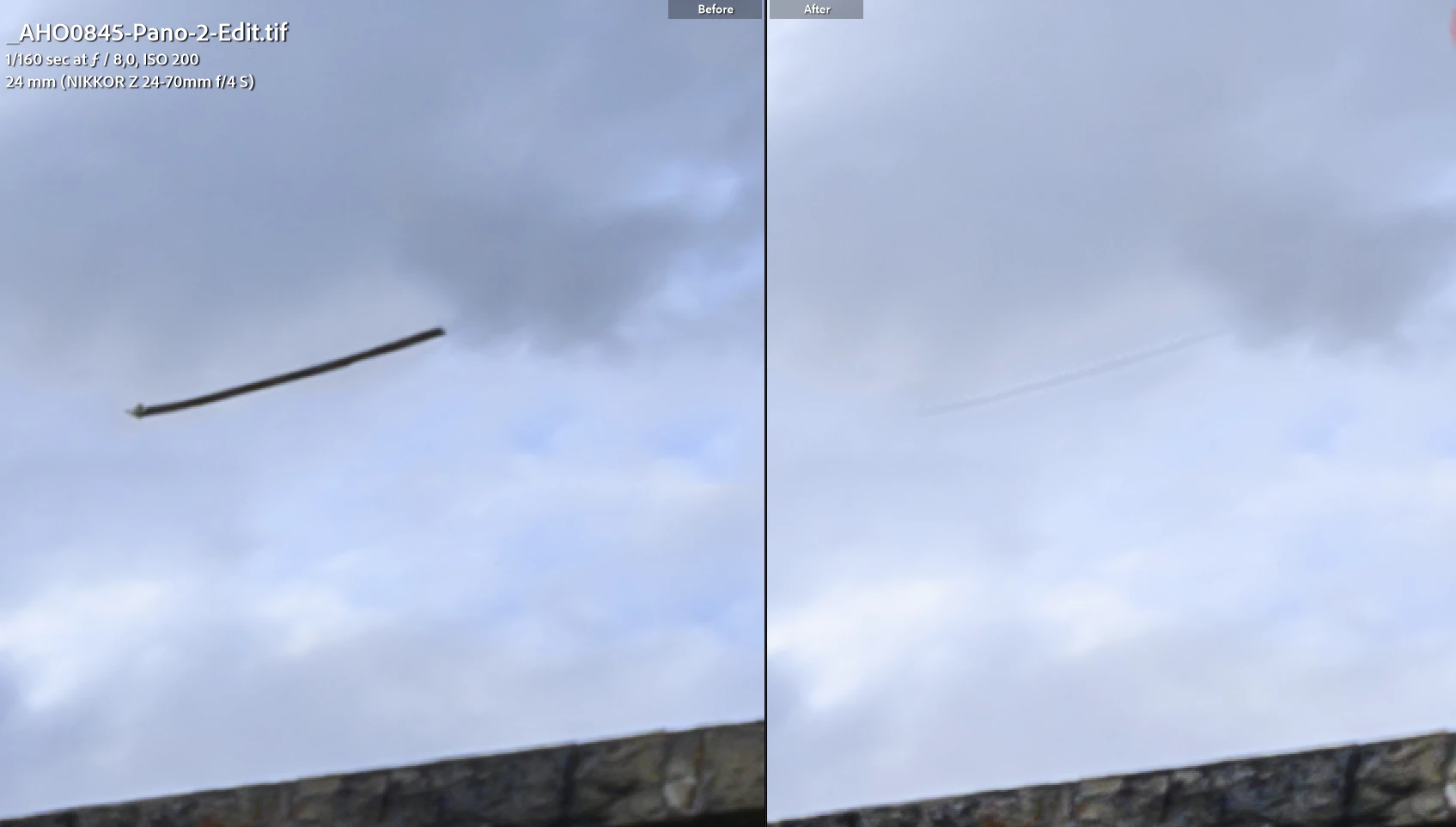 Then I discovered an error from the panorama process, a black "stick" in the sky. When I tried to remove this in LrC, every way I tried left a light shadow og the "stick" I tried Remove AI with all alternatives, Heal and Copy, but the lighter stick was still there.