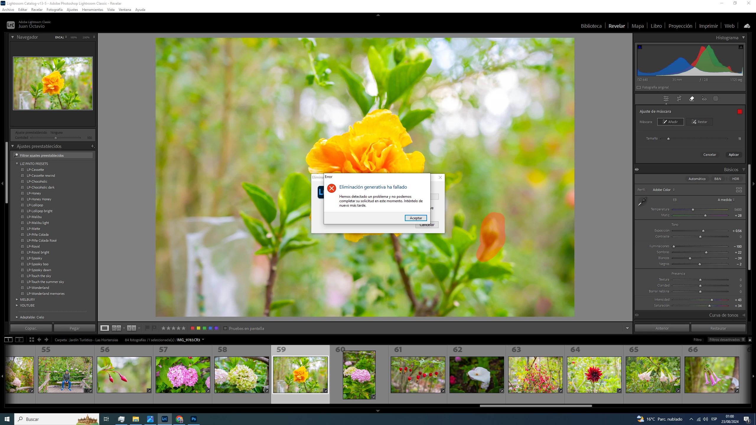 HOLA, LIGHTROOM CLASSIC 13.5 NO ME DEJA USAR LA IA GENERATIVA PARA QUITAR OBJETOS NO DESEADOS, SU AYUDA POR FAVOR.