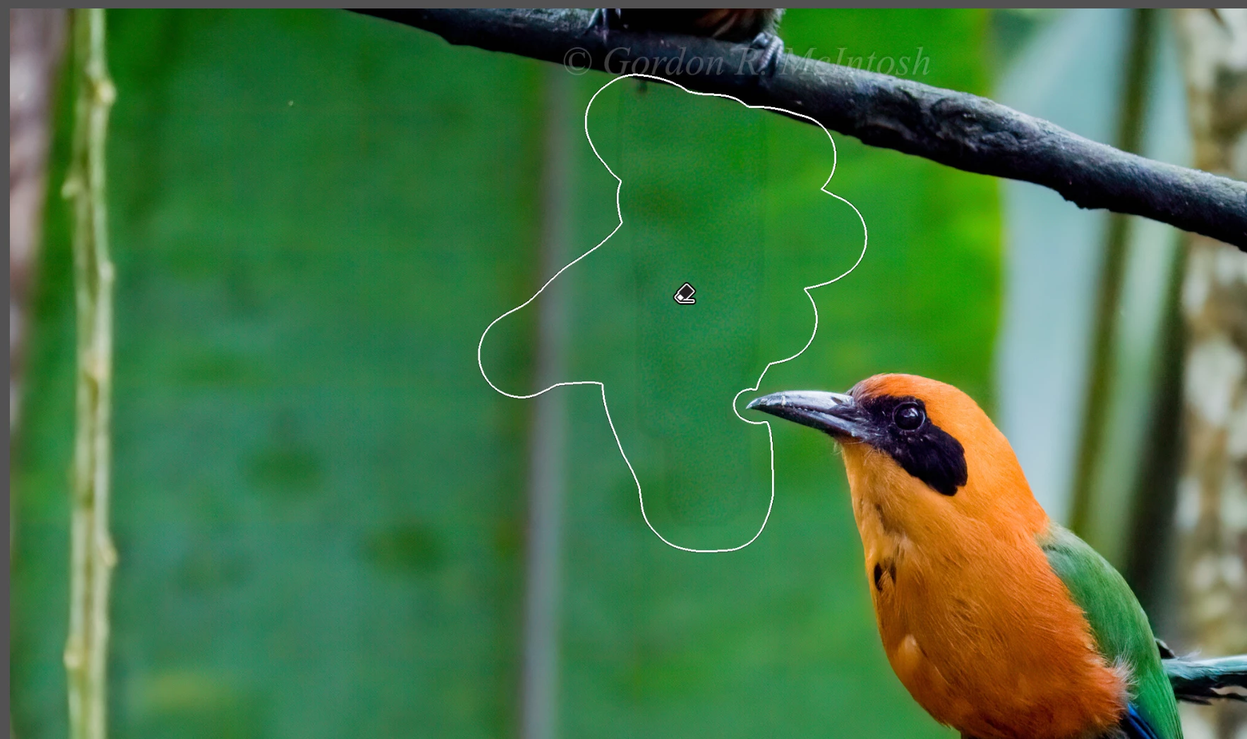 @gordonm67764613: "You can see the area selected outline infont of the bird's beak & I have tried to include the bird on the branch above too just to see ifthe outline will go away but it doesn't."