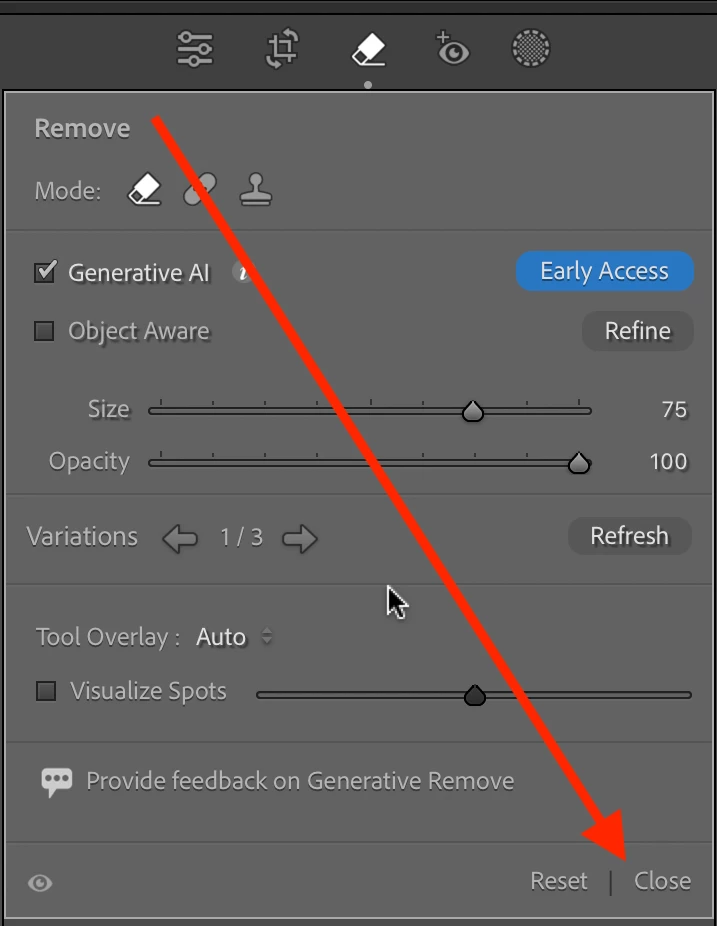 • Make sure the “generative AI” checkbox is enabled before you start brushing (note: when unchecked, Lightroom will use Content-Aware Remove to fill your brushed spots).