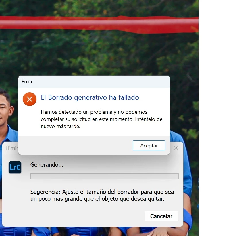 @brluigi: Translation of message, "Generative Erase has failed. We have detected an issue and are unable to complete your request at this time. Try it again later."