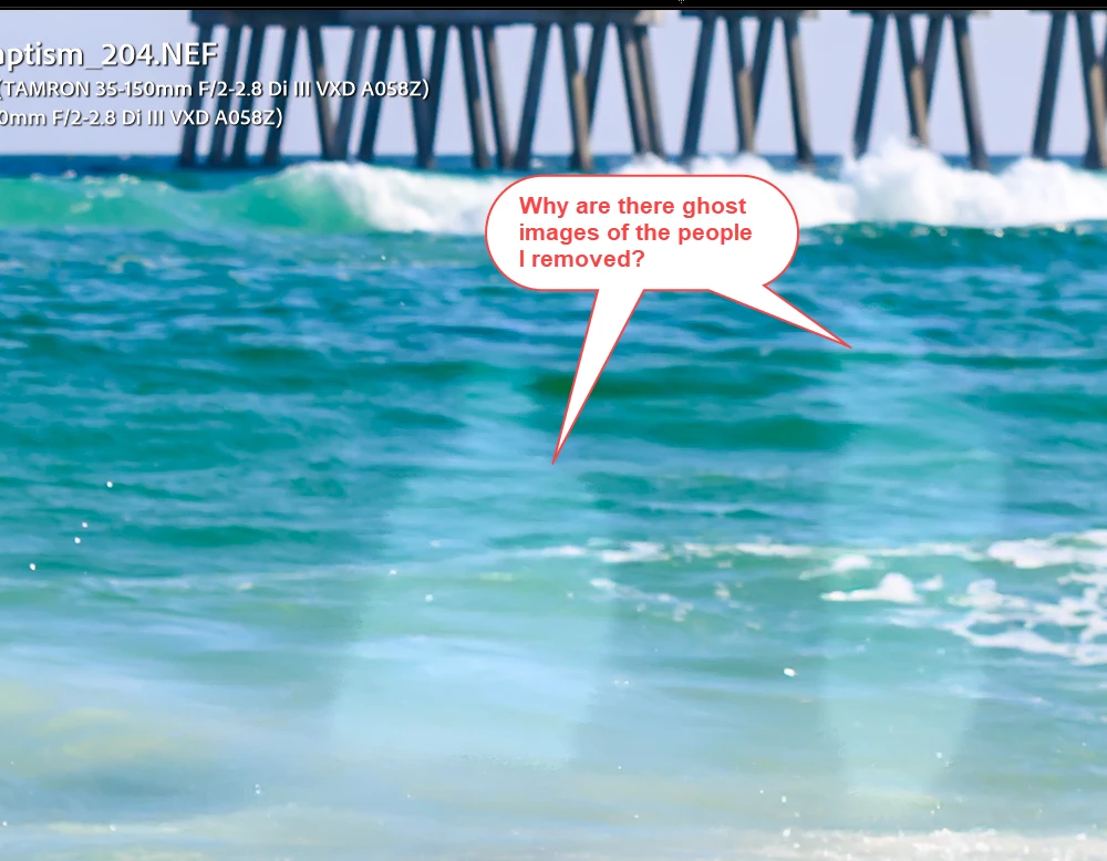 For the most part generative AI has saved me quite a bit of time with removal of distracting objects in images; however, I've noticed that when removing people from certain water scenes (ocean shore) and the people are in the water, the AI does effectively remove the people but leaves a ghost image of them with the generated area having a slightly different tonality from the rest of the water.