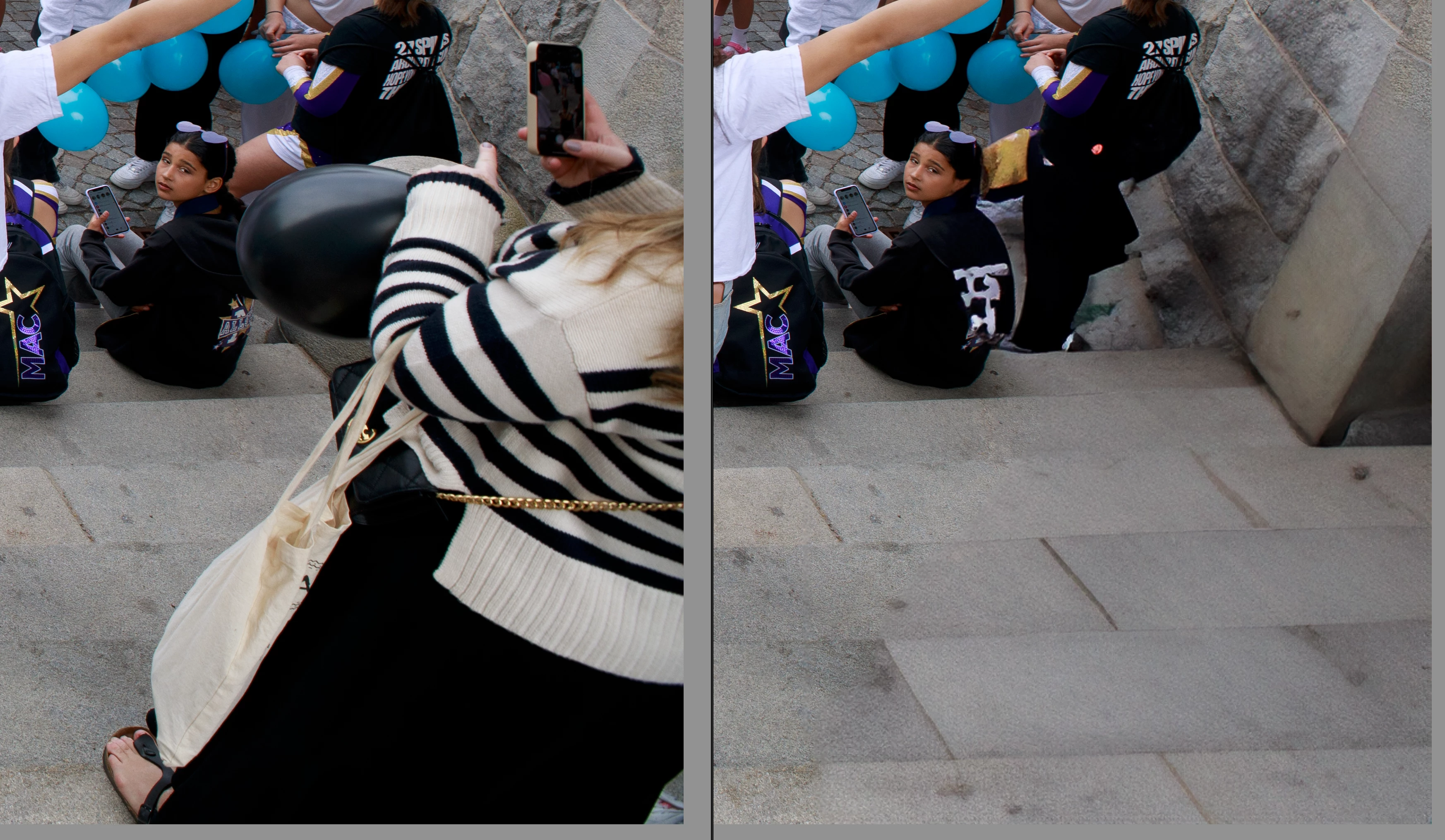 Here used to remove a person with a pattern that draws attention. And the two giry and the pavment are nicely filled.