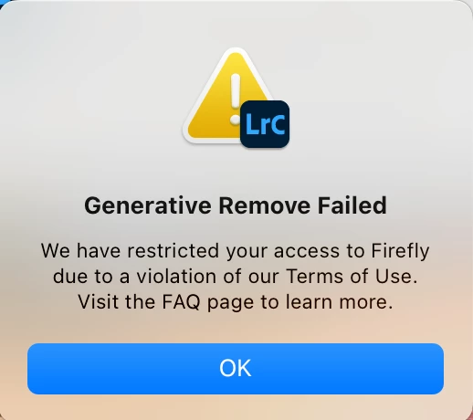 Just updated Lightroom Classic to the latest version a few days ago (v 13.5.1) and now when I try to use Generative Fill, I get a pop up saying Generative Fill Failed and sometimes a pop up saying my access was restricted due to a violation of terms. It makes no sense. Unsure if it has to do with the version I am on as it has worked up until now. I rather stick to using Lr for this feature rather than launching photos into Photoshop as it saves me time working only within Lightroom. Im on macOS (which is also up to date). Im hoping there is a fix for this!?