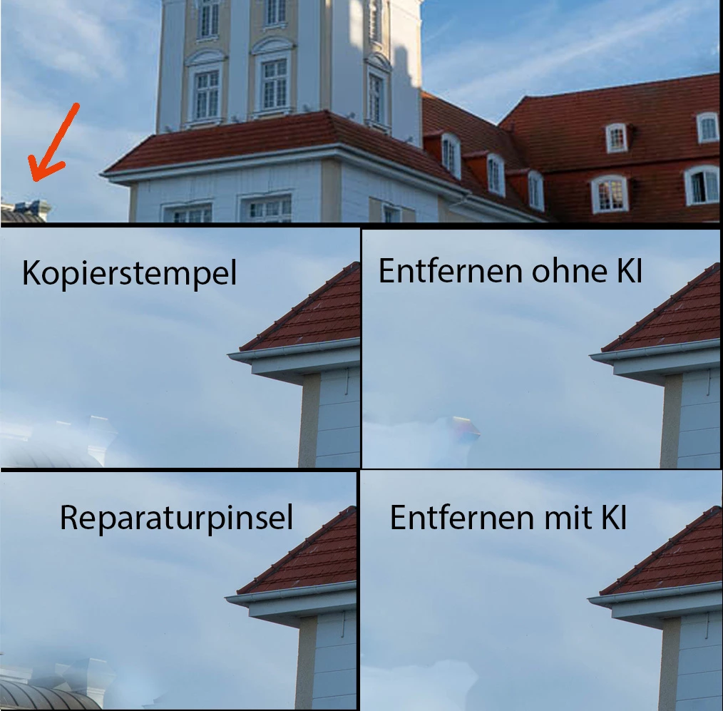 Es gibt immer mehr Funktionen um störende Bildteile zu entfernen, aber an den Bildrändern funktionieren alle nicht. Ich kann benutzen was ich will, das Resultat ist immer schlecht. Erst mit Photoshop funktioniert es zufriedenstellened.  Ich habe mal ein Beispielbild mit allen 4 möglichen Funktionen bearbeitet (siehe Anhang).