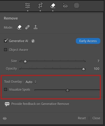 • Make sure the “generative AI” checkbox is enabled before you start brushing (note: when unchecked, Lightroom will use Content-Aware Remove to fill your brushed spots).