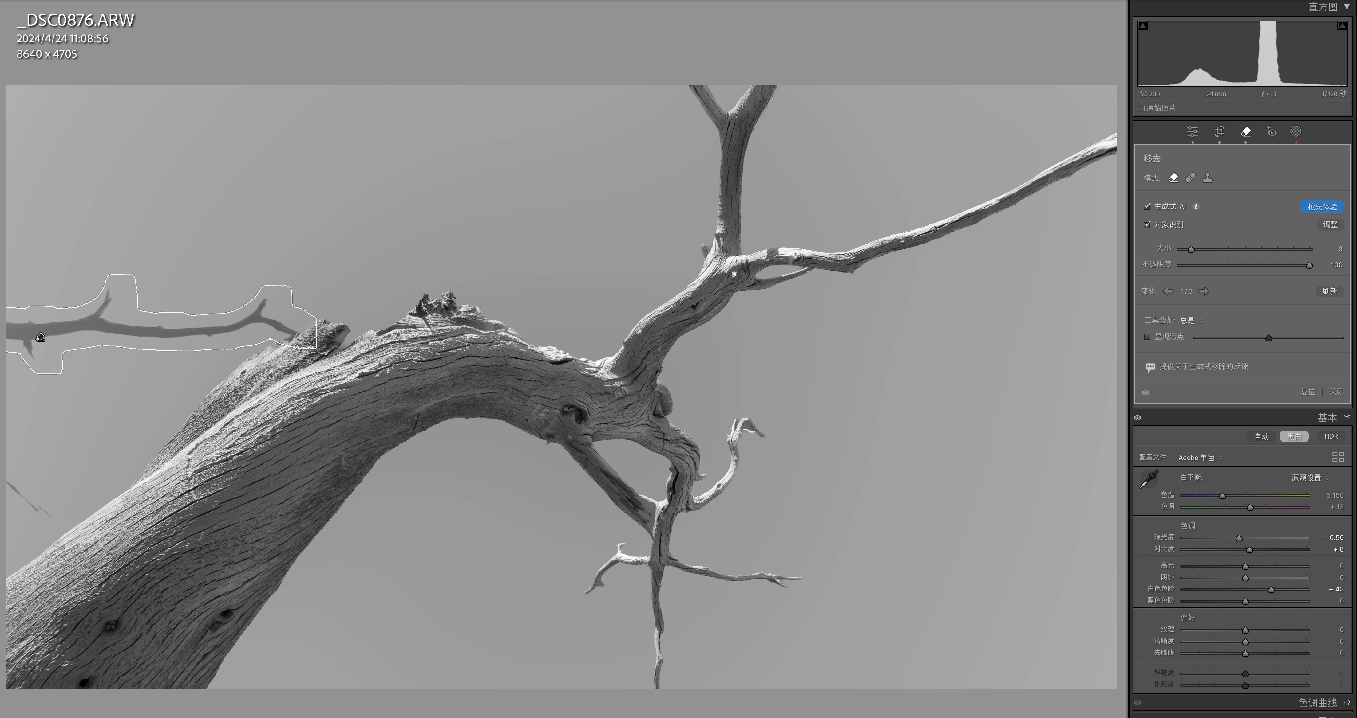 Today I tried using the generative removal tool to remove an object from a black and white photo. I found that after the removal, the shadow of the object was still included. So, it seems that the generative removal tool might not be fully effective in black and white effects.
