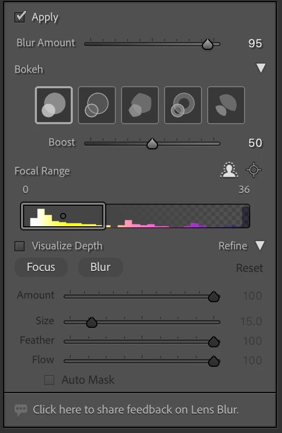 • No, presets and copy + paste workflows are not currently enabled for Lens Blur during Early Access.