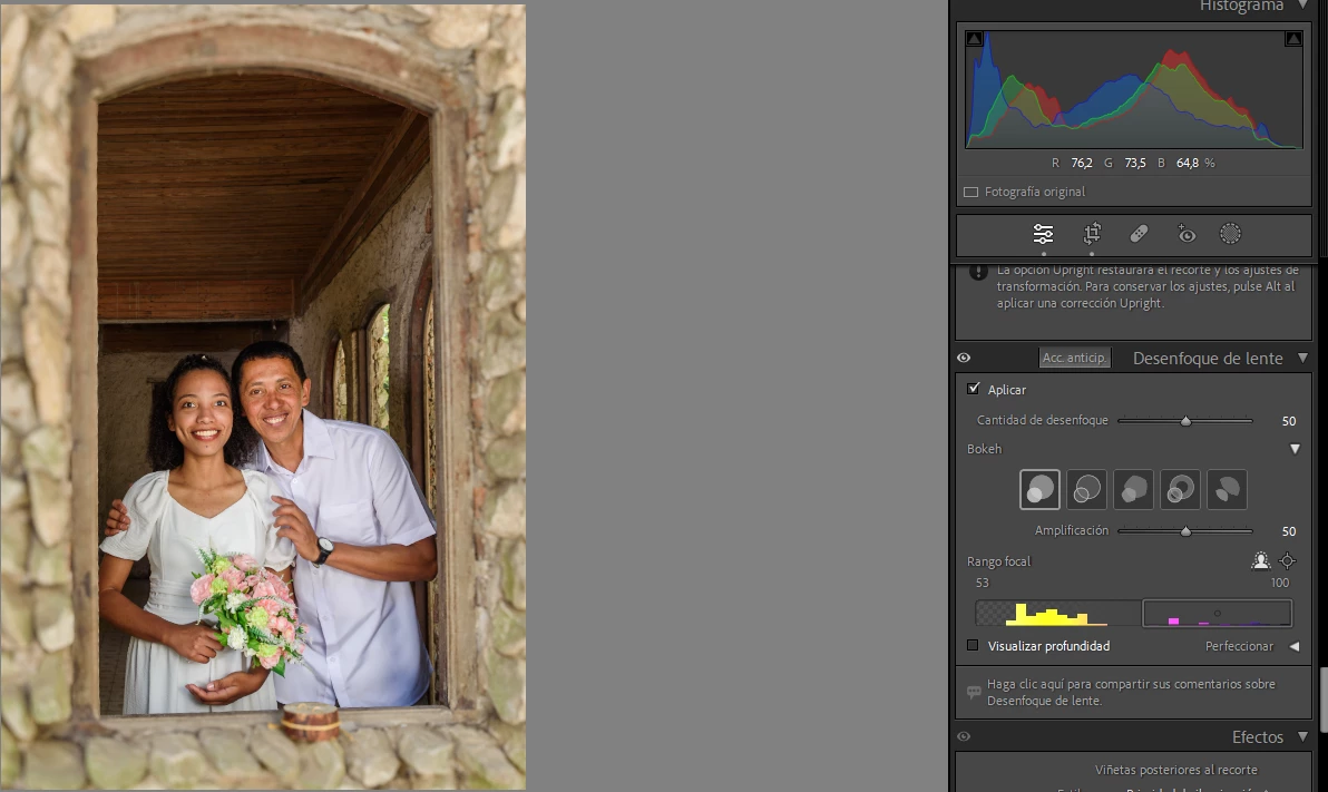 • Lens blur will automatically prioritize focus for the detected subject, but you can also interactively adjust the focus distance. Precise focus range tuning is also available (currently desktop only: Lightroom Desktop, Lightroom Classic, and Camera Raw).