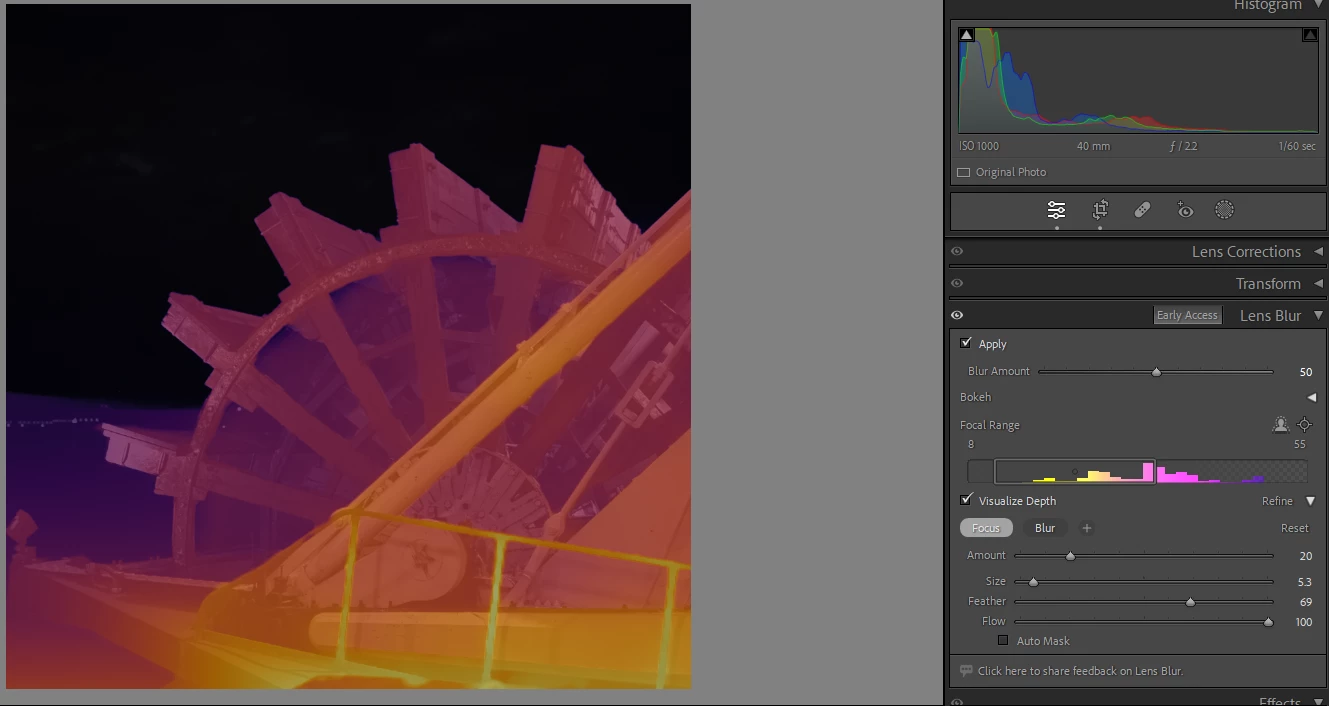 I'm not seeing a way to remove part of what's masked in the focal range. Even when I adjust the slider to yellow and pink, it's still showing purple on part of the image that is in the distant background. I would like to be able to remove part of it like how masking works.