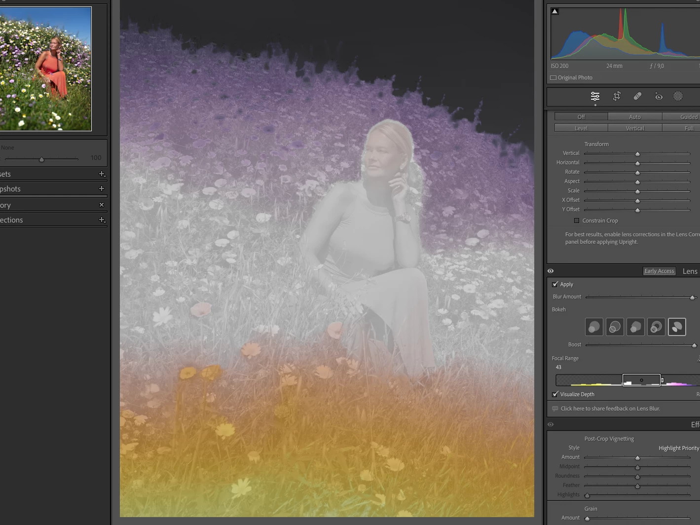 • Lens blur will automatically prioritize focus for the detected subject, but you can also interactively adjust the focus distance. Precise focus range tuning is also available (currently desktop only: Lightroom Desktop, Lightroom Classic, and Camera Raw).