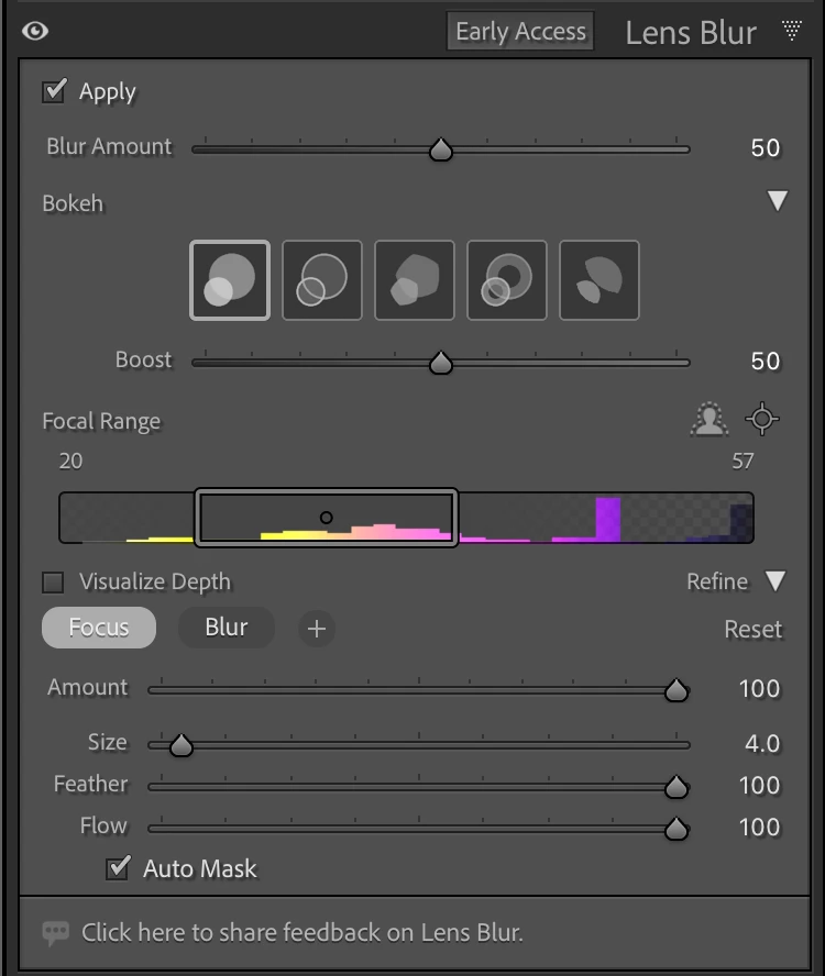• No, presets and copy + paste workflows are not currently enabled for Lens Blur during Early Access.