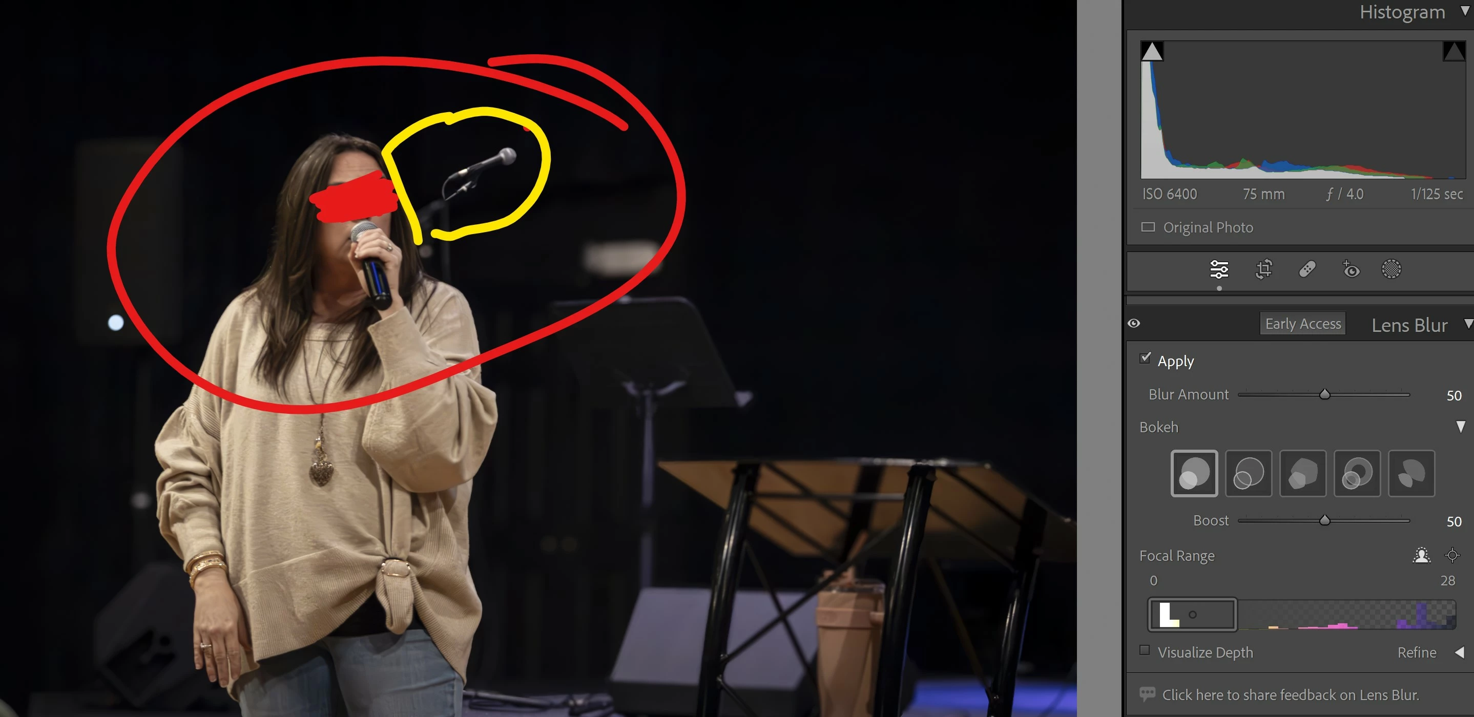 • Lens blur will automatically prioritize focus for the detected subject, but you can also interactively adjust the focus distance. Precise focus range tuning is also available (currently desktop only: Lightroom Desktop, Lightroom Classic, and Camera Raw).
