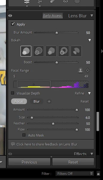 3. I like that after you paint Depth you can adjust the blur amount, but the ability goes away when switching over to a different control such as Focus or if toggling the Lens Blur effect off, etc. Maybe similar to having multiple masks, I'd like to be able to retain a painted section to be able to adjust its blur level later without re-painting.