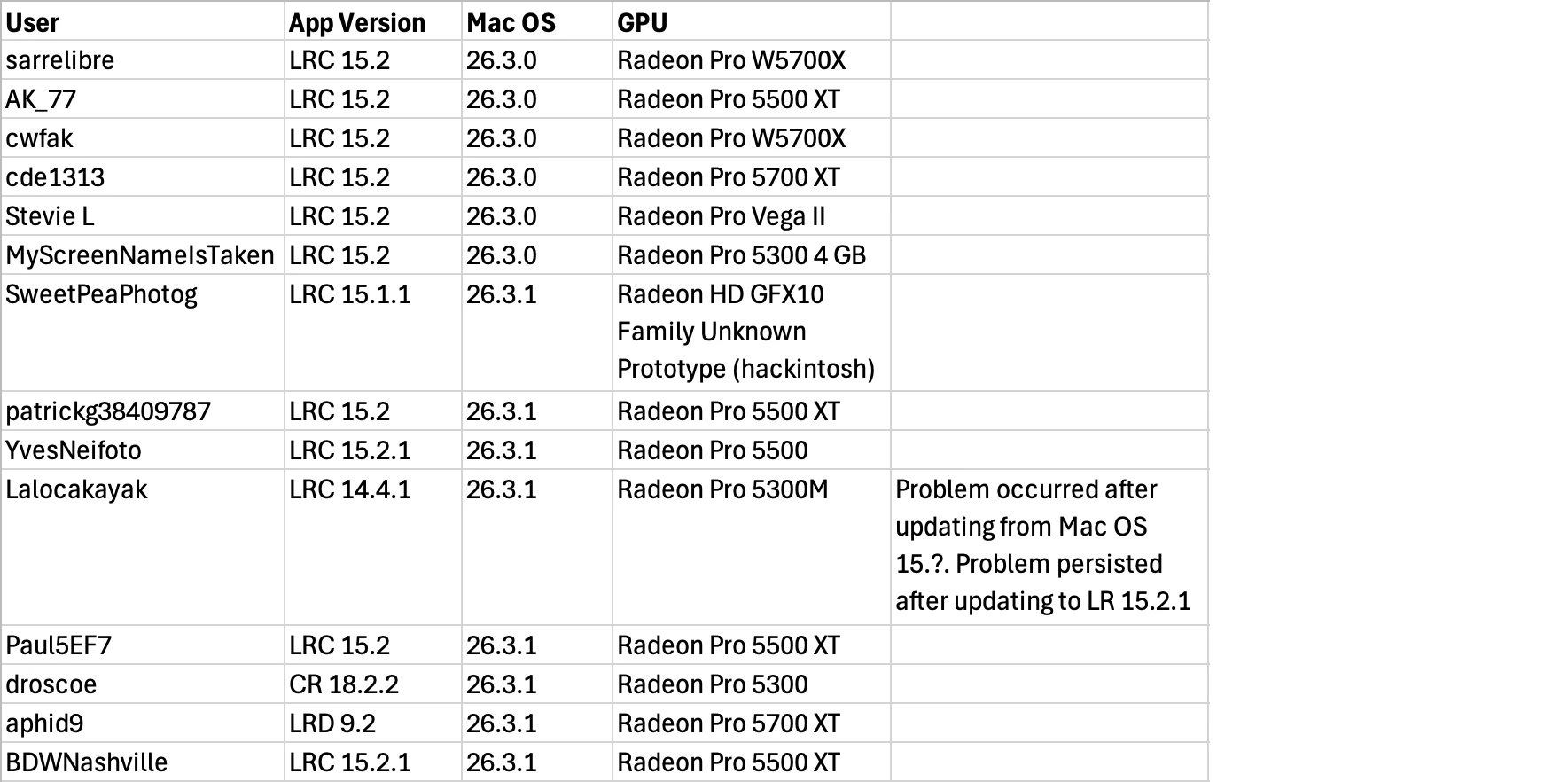 - Starting 4/1/24 on Mac OS 14.4.1 (released 3/25/24), many Intel Mac LR users with AMD 500- and 5000-series GPUs started reporting strange image artifacts in rendered raws: