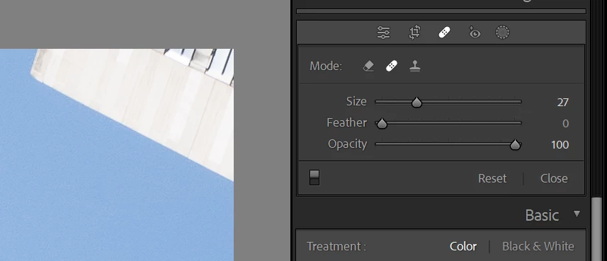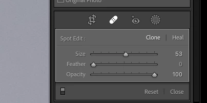 Problem: When I use the spot removal tool in Lightroom Classic version 11 to remove a leaf against open sky after Sky Select was used, Lightroom fails to remove the spot completely. It leaves a light gray version of the leaf behind. See samples below. I checked and opacity is set to 100%.
