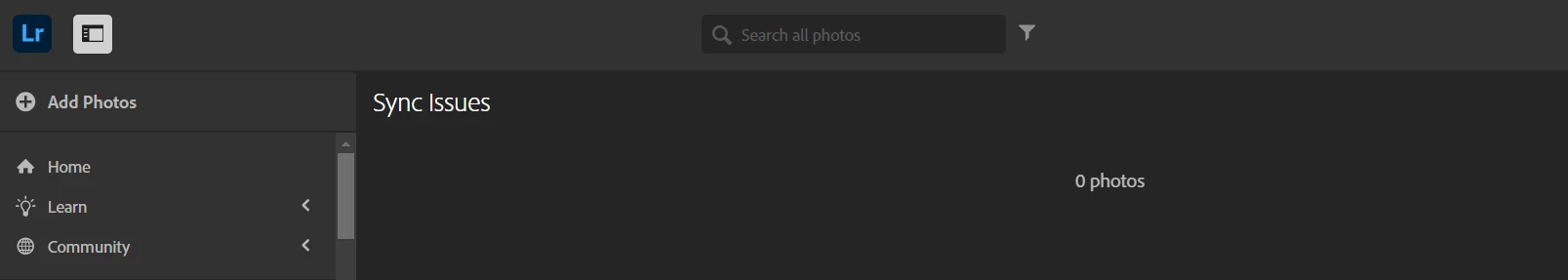 Is there, or could you add some sort of filter for sync status, like lightroom desktop has, so we can find these photos that have lost their way?