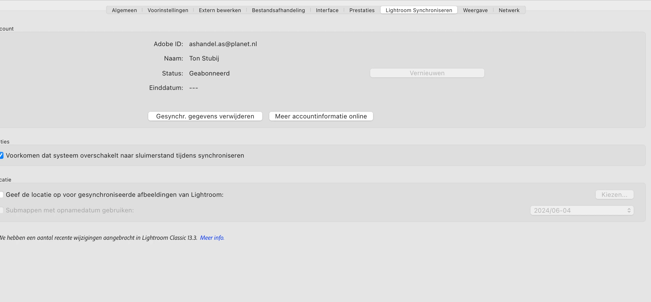 Na de update 13.3 blijft Classic synchroniseren bij 1 foto. Het opnieuw aanmaken van de sync database verhelpt het probleem niet. In de webversie lightroom staat geen fout in een verzameling. Getracht de synchrisatie opnieuw te maken in de nieuwe procedure, geen resultaat.