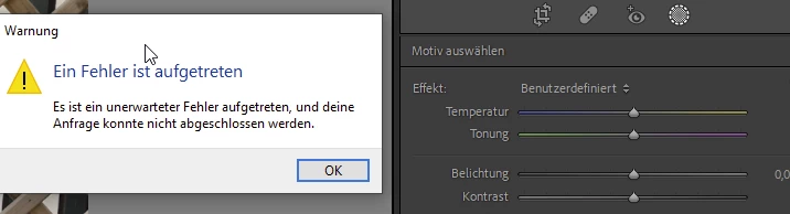 Update auf LR 11 ist erfolgt. Erhalte immer die Fehlermeldung: „Es ist ein unerwarteter Fehler aufgetreten und deine Anfrage konnte nicht abgeschlossen werden“ bei neuer Maskenfunktion "Himmel auswählen". Hat jemand ne Idee warum das auftritt?