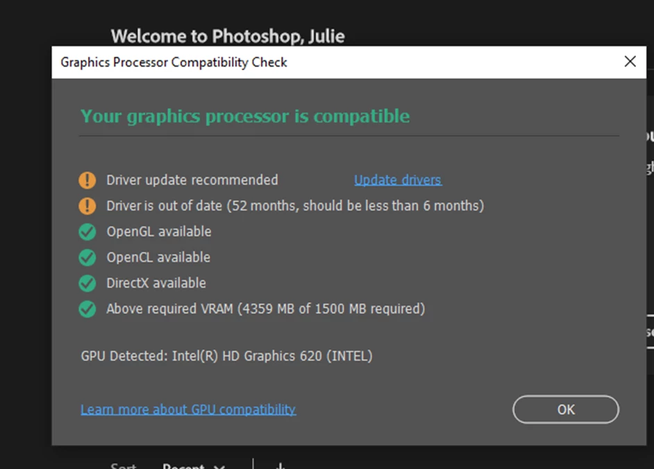 What desktop OS and Application versions. If  Photoshop does Photoshop menu Help>GPU Compatibility show your GPU is supported and Drivers are up to date and all features are working OK?