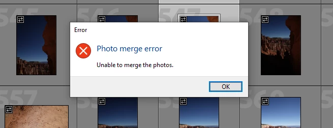 It doesn't matter if I'm trying to merge 2 photos or 20 photos - I get the same error even though LR is able to merge them and reder a preview. The error only occurs when I start the merging task
