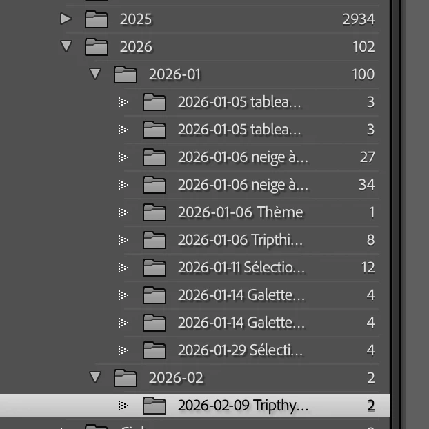 Mes photos sont classées par AAAA/MM/JJ. Si je clique sur le petit bouton à sur année j’obtiens MM et sur MM j’obtiens le dossier JJ. Mais alors je ne peux plus développer le dossier JJ le petit bouton à gauche est grisé