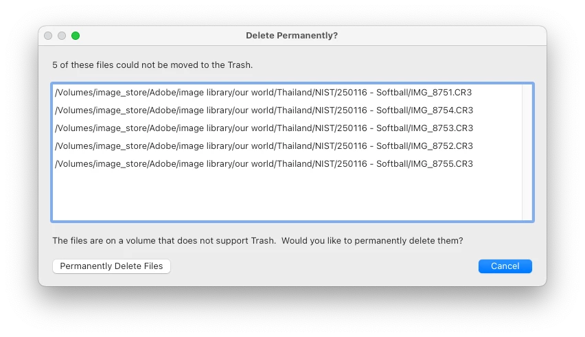 The prompt to perminantly delete files on a Mac with Lightroom located on an NTFS volume should be removed. I have full READ/WRITE access to the NTFS volume and up until now when files were deleted form Lighroom they were moved to the trash in the nomral fasion. It is just a file system afterall. Please fix this bug. Thanks