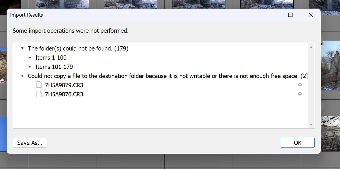 I am having a problem where everytime I try to import photo/video files from my R6 via Lightroom, I get an error indicating the destination folder is not writeable or there is not enough free space (have tried various destination drives with same issue). Permissions are set to full control for all groups. Free space is near 1TB...so neither of these should be preventing the program from importing. This is growing incredibly frustrating.