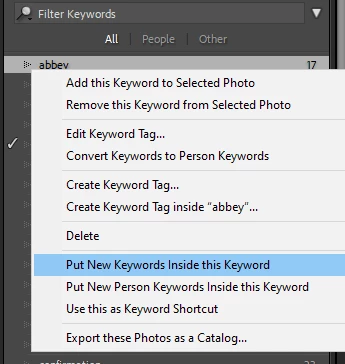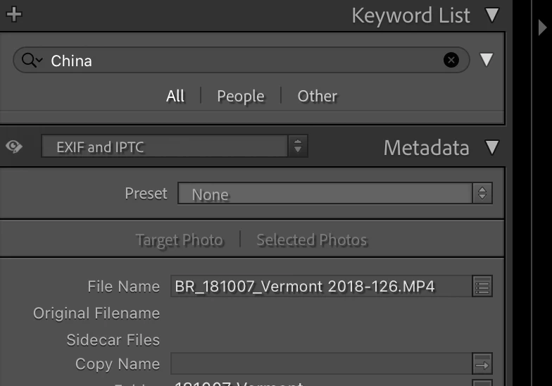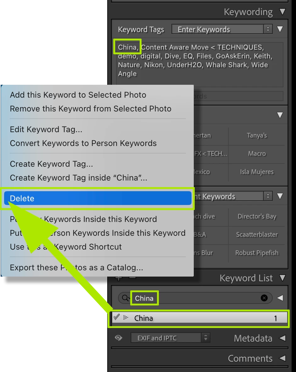 I have no photos in my current catalog from China and do not have China as Keyword and it does not appear when I select in "Keyword Tags", just "Keywords". However, when either I select "Keywords & Containing Keywords" or "Will Export" China apears and I cannot delete this from the displayed list.