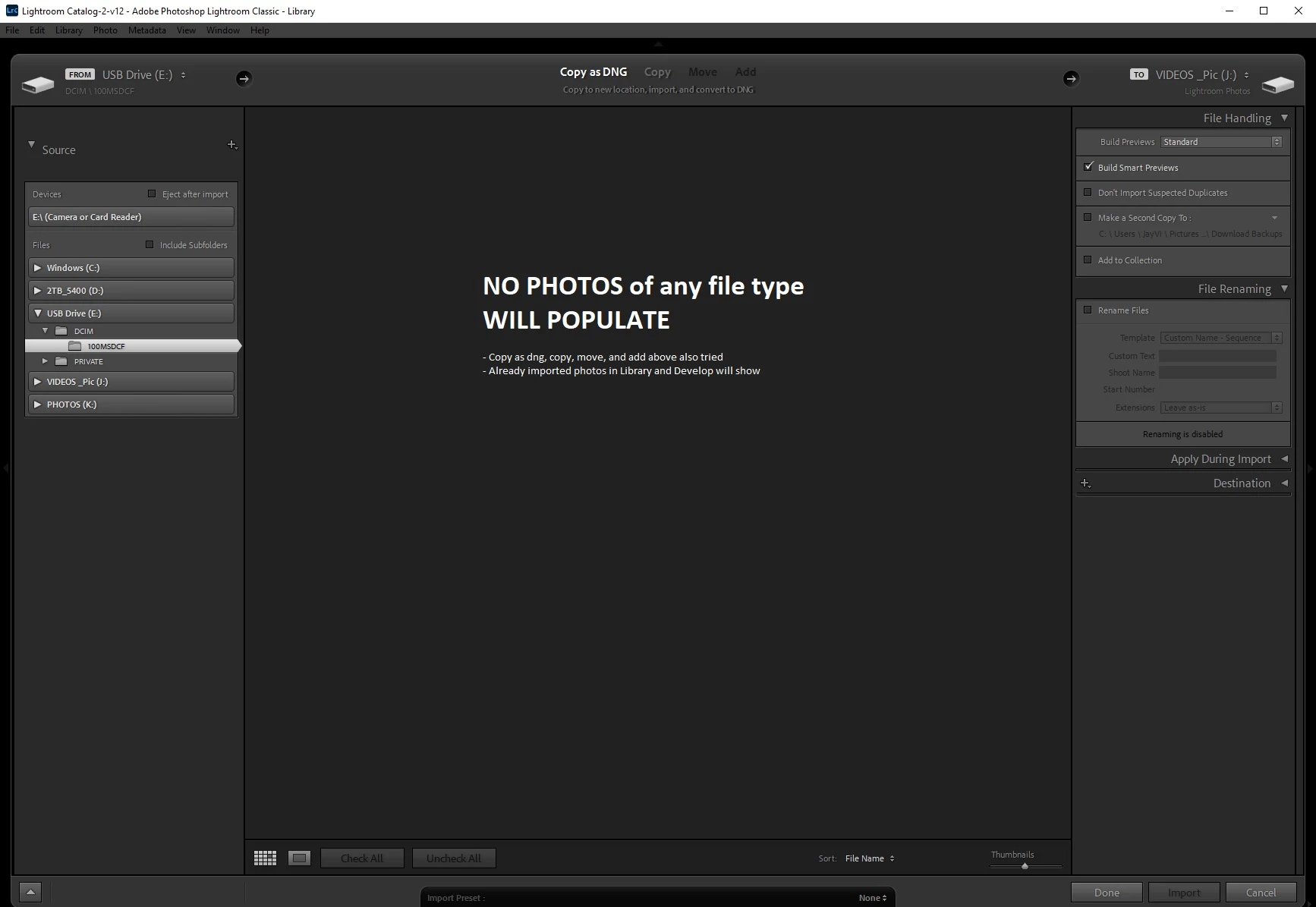 I tried with numerous other photos from other directories to import, to include different file types such as jpeg, etc, and still no photos show up in window (nor do 'greyed out' photos as if already copied).