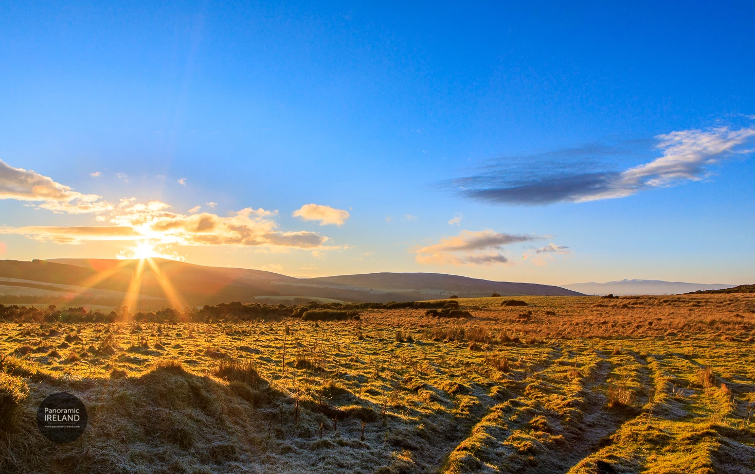 Here, one of 2021's first sunsets in the Irish countryside where I wanted to capture the sunburst, blue sky, distant mountains and frost on the field in the foreground.
