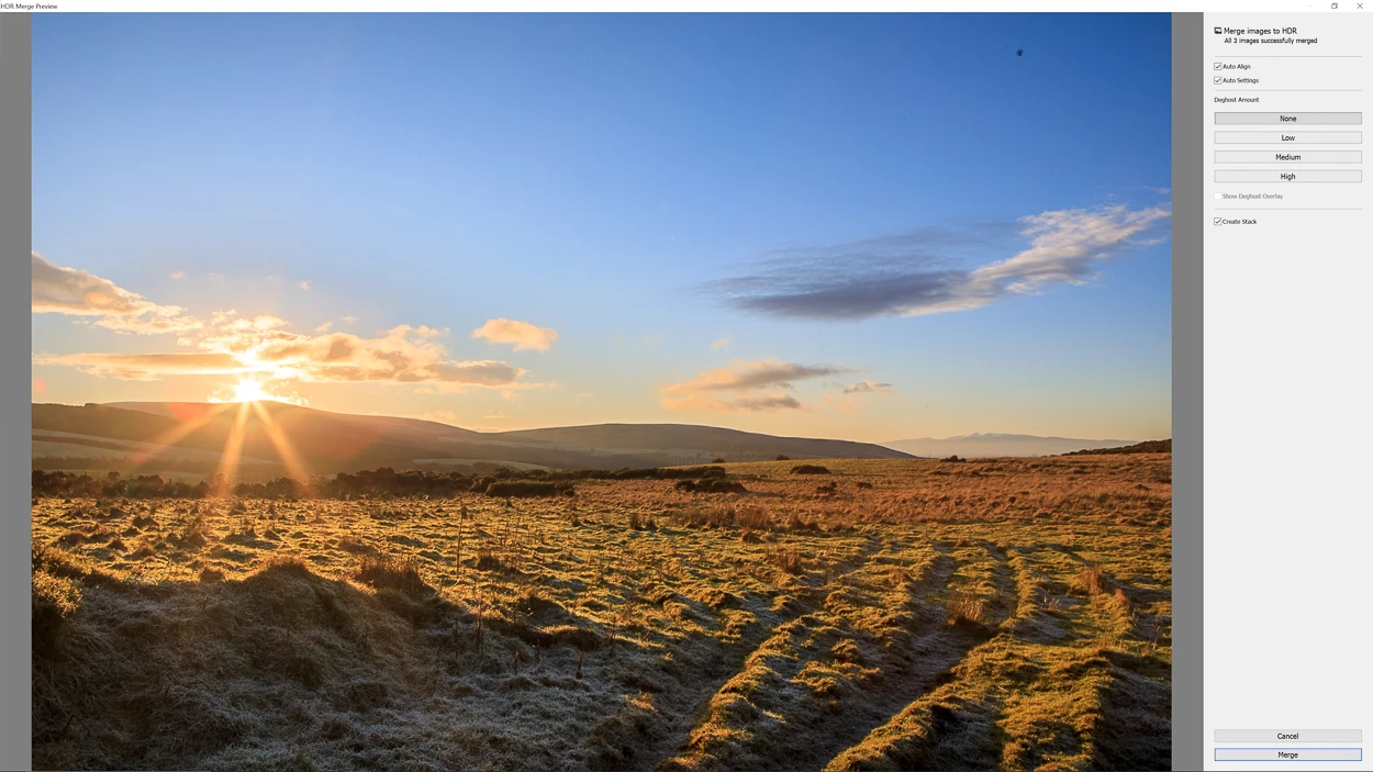 - In this case I have chosen Auto Align and Auto Settings, the image bracket was taken handheld so I want to make sure any movement is taken care of, and also to create a starting exposure when back in Lightroom Classic's Develop Module.