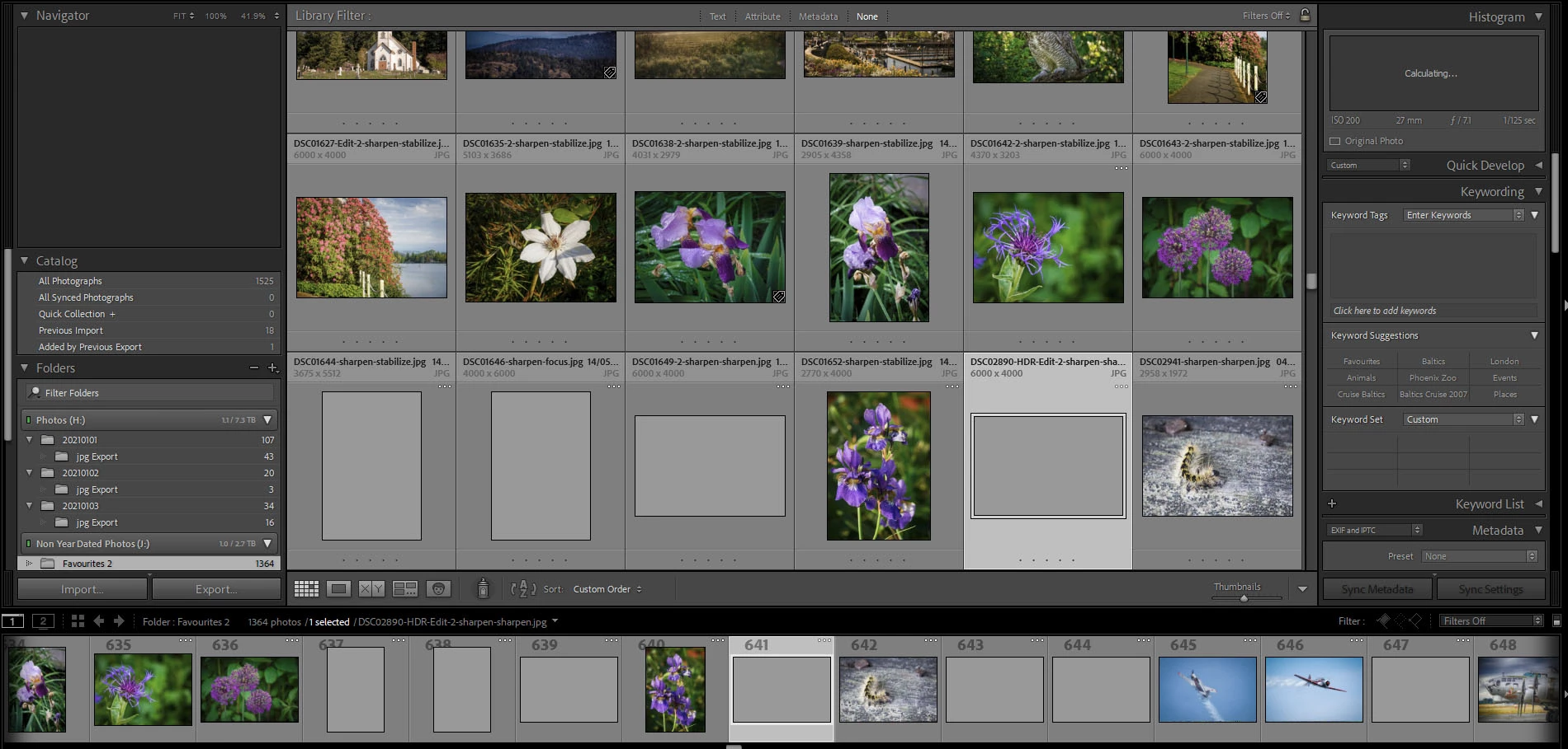 Created a new catalog for the new year. Imported all my Facourites from my external drive, into this new catalog. The issue is many of the photos show solid grey. If I click on one of them, the histogram says calculating andit will eventually appear. The issue is this takes anywhere from a few seconds to several minutes, for the image to come up.And I have to do eacj image on it's own.