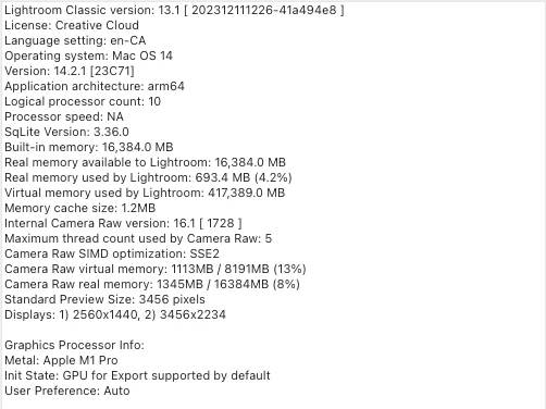 I have a 2021 16" MacBook Pro with an M1 pro chip and am using the latest version of macOS, Lightroom, and MacOS.