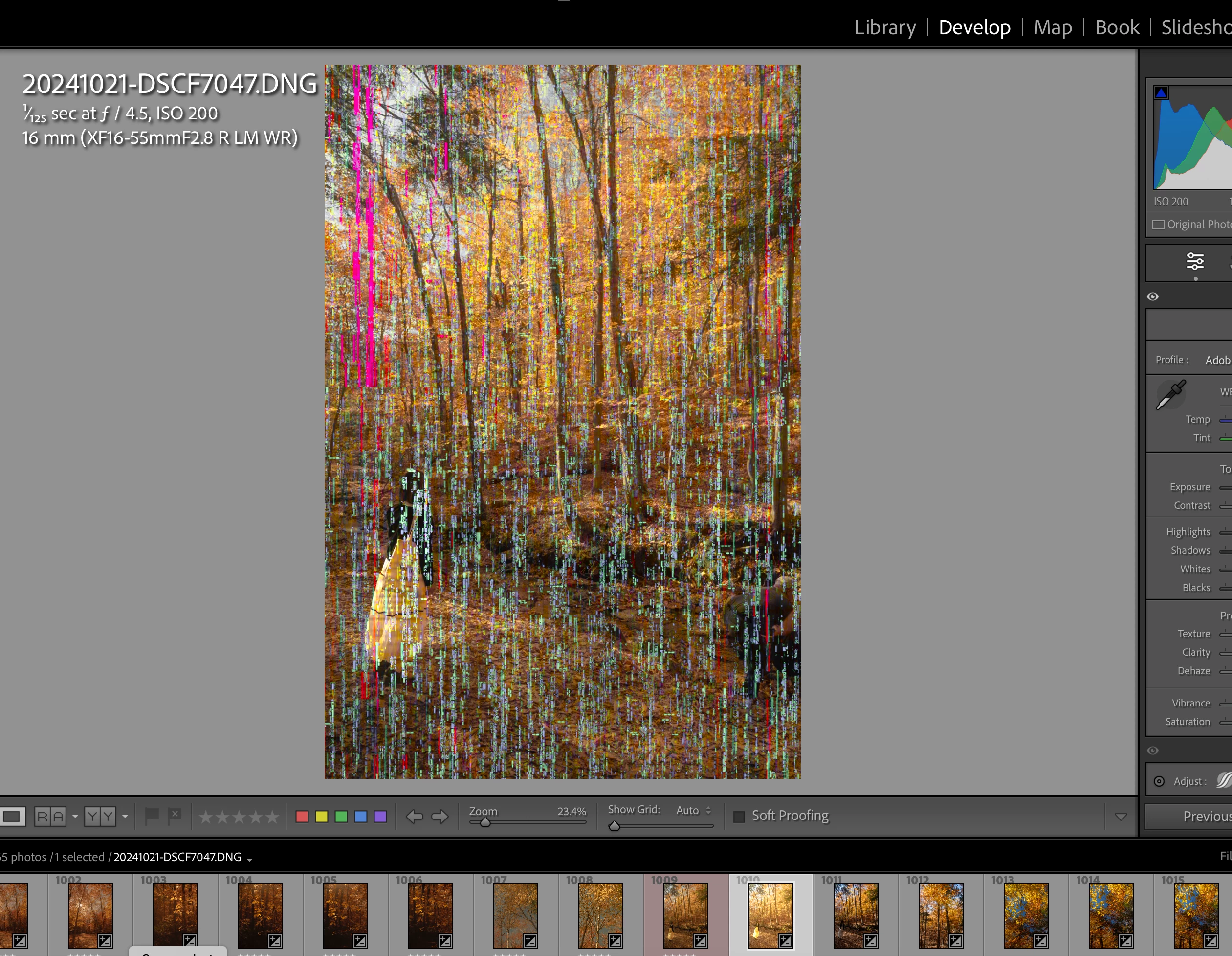 Photos look fine in Library, but become pixelated and colors corrupted in Develop. Please see attached screen shot.