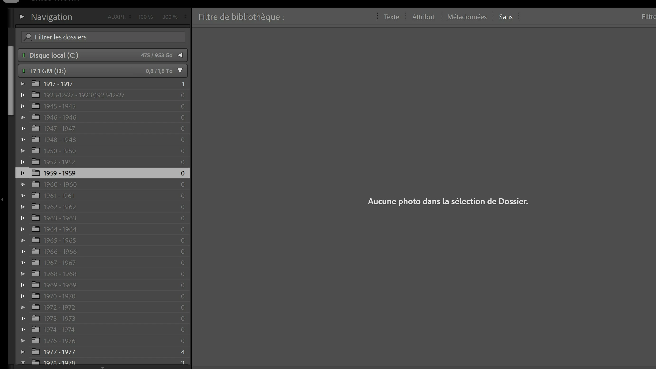 J'ai tenté de réimporter mes photos de mon disque rigide externe dans le but de pouvoir les afficher et ensuite modifier. Malheureusement, l'importation s'est faite seulement pour quelques dossiers, et j'ai maintenant des dossiers avec 0 photos et sans marqueur "?" afin que je puisse rechercher les photos manquantes. J'ai donc 30,000 photos manquantes, mais tous les dossiers apparaissent dans le catalogue, sans aucun moyen de le mettre à jour ou rafraîchir les liens. Le seul choix qui me reste est en fait de resynchroniser dossier par dossier (plusieurs sous-dossiers par dossier année. À l'aide!