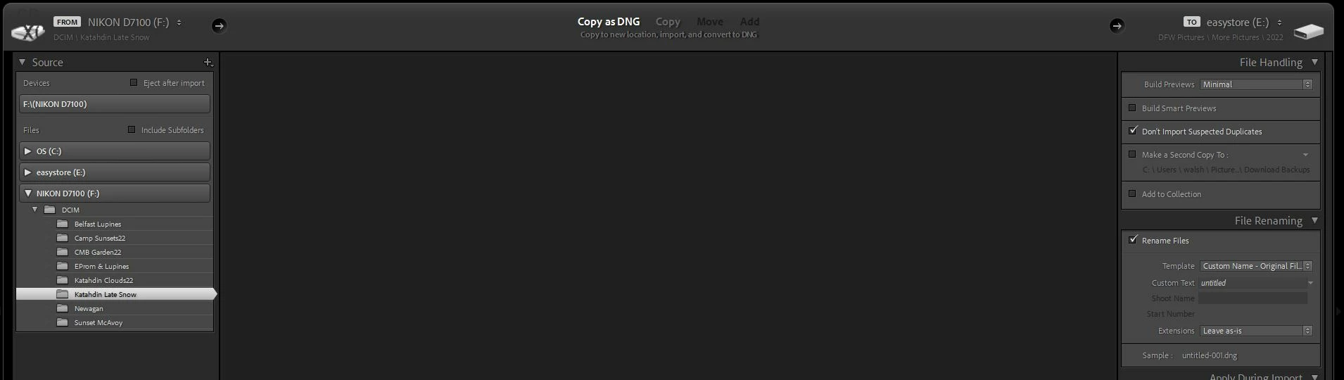 This problem just started. Using LR 11.4 on Windows 10 PC. Went to import raw files from memory card using card reader in my PC. Something I have done hundreds of times. Selected folder and subfolder but no photos are displayed in the grid or single format. Just see blank black screen. Typically use COPY AS DNG but tried COPY as well. No difference. This was working fine with same memory card 15 minutes earlier. Have opened and closed LR as well as rebooted computer several times but same result. LR will show me the files in Explorer and I can view photos using any other photo viewer. This problem is occuring with any memory card or any drive on my computer. I cannot view any photo to import. Reviewed preference settings - did not find anyting unusual. I have researched on Community and found similar problem from 2018 that was cured by selecting COPY vs ADD however in my situation, I was already trying to COPY AS DNG and ADD is blacked out so not even an option.