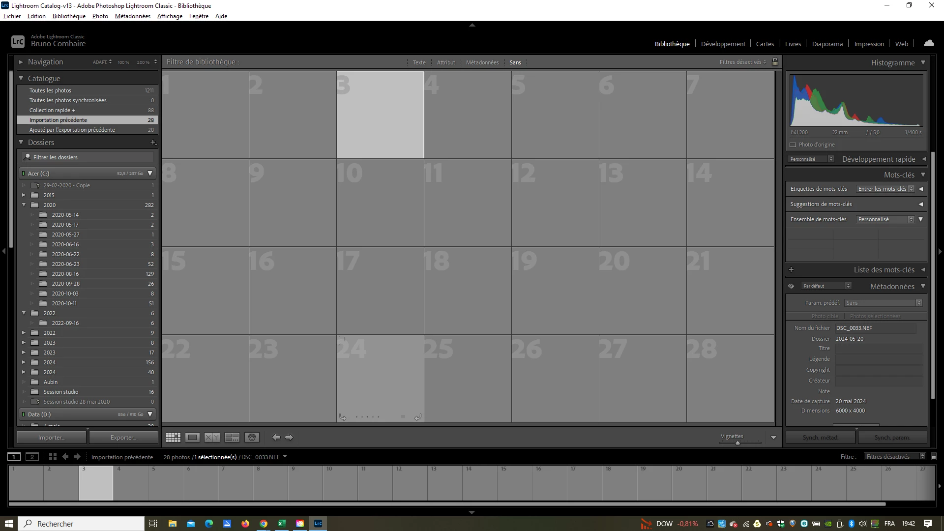 1° Plus d'imagettes dans la bibliothèque mais histogramme dans partie droite et photos existantes dans le traitement mais sans les imagette de du dessous.