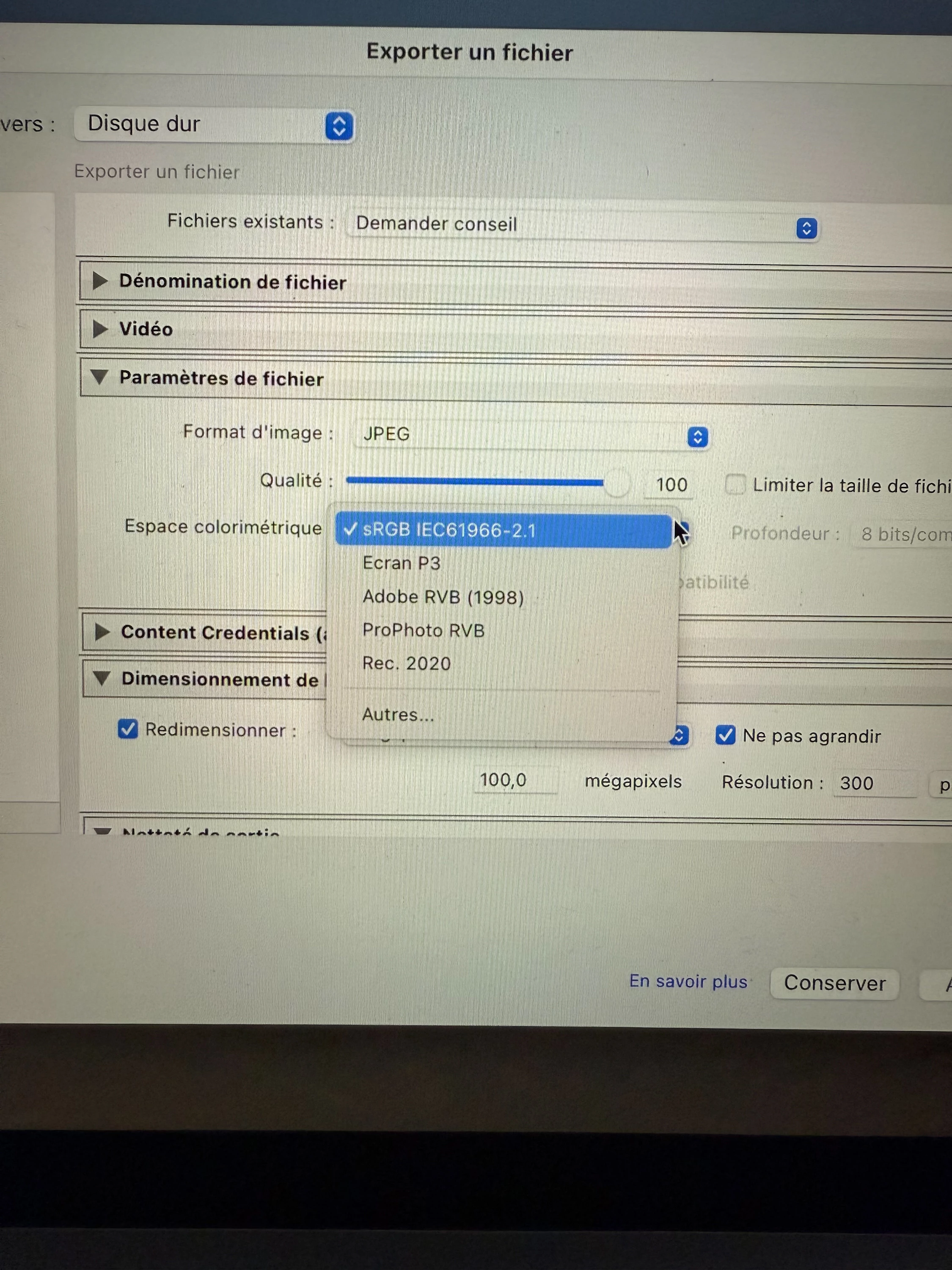 Mais depuis je ne peux plus exporter mes photos en sRVB.